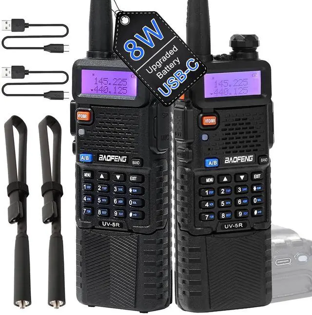 ^^ Kit includes: 2 x BAOFENG UV-5R radio with original & 18.5 -inch antennas, 2 x 3800mAh upgraded battery(USB-C Charging), 2 x Type-c charging cable, 2 x Headset, 2 x Desktop charger, 2 x Belt clip, 2 x Hand strap, 1 x English manual.
