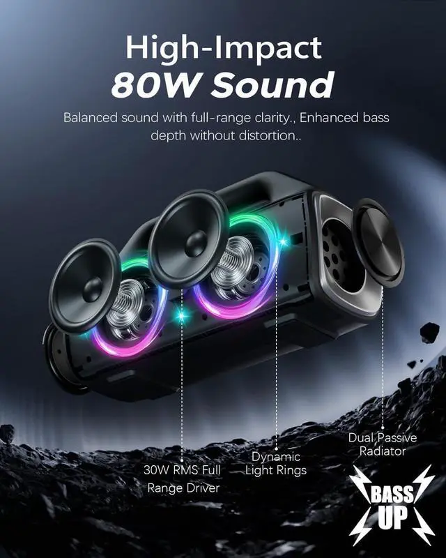 Powerful Deep Bass80W Peak speakers bluetooth wireless loud, equipped with two 3.6 -inch full-range dual high-performance drivers, built-in DSP chip, faster processing algorithms from the technology to improve the sound quality assurance. Speakers bluetooth wireless loud with bass, you can release and burning passion in the dynamic rhythm of music! ^^ TWS Stereo Surround and Light ShowPair 2 of YIER Bluetooth speakers with lights to get the TWS function and a fully immersive and spatial audio experience. Also, the light show of speakers bluetooth wireless is crazy, it is a brand new beating mode, occupy your field of vision, light up the fiery party, and push the passion to a new level.