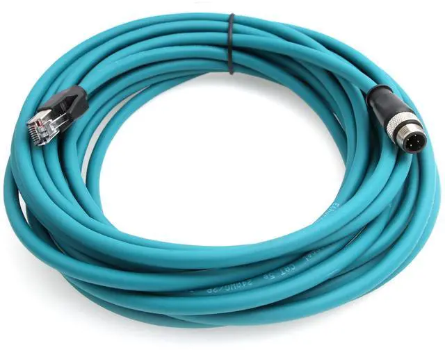• M12 4pin D-code RJ45 E4 Plug ETHERNET Cable is a single foil twisted pair cat5e cable with a blue PUR jacket rated at 24 AWG wire M12 Connector with gold plated 4 pin coded contacts ensure reliable connectivity