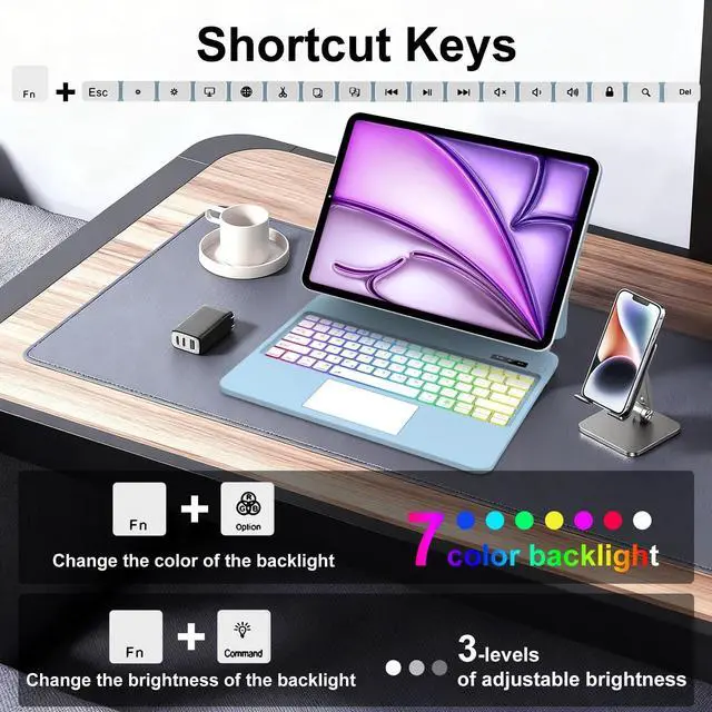 Rainbow Color Backlight Keyboard with ShortcutsFluidly and accurately typing on the lighted air 11 keyboard for ipad air 5th gen even in a dark room, ergonomic keys, rainbow colors of backlight, and three adjustable backlight brightness levels give you a comfortable typing experience. No more searching around for basic functions, be more efficient with a full row of practical shortcuts to adjust brightness levels, change backlit colors, media, volume control, and more