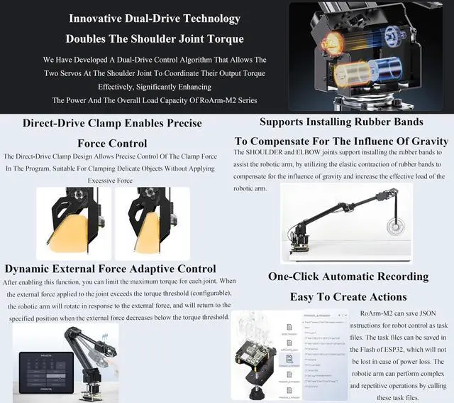 Provides modularized demos and tutorials for zero-based users, easy to get started. ^^ Innovative dual-drive technology, doubles the shoulder joint torque--- We have developed a dual-drive control algorithm that allows the two servos at the shoulder joint to coordinate their output torque effectively, significantly enhancing the power and the overall load capacity of RoArm-M2 Series ^^ Supports installing a camera to extend visual applications--- Comes with a camera holder and open source for the related drawings. You can directly install a camera with the corresponding size or other cameras with an adapter ^^ Comes with Online Development Resources /User