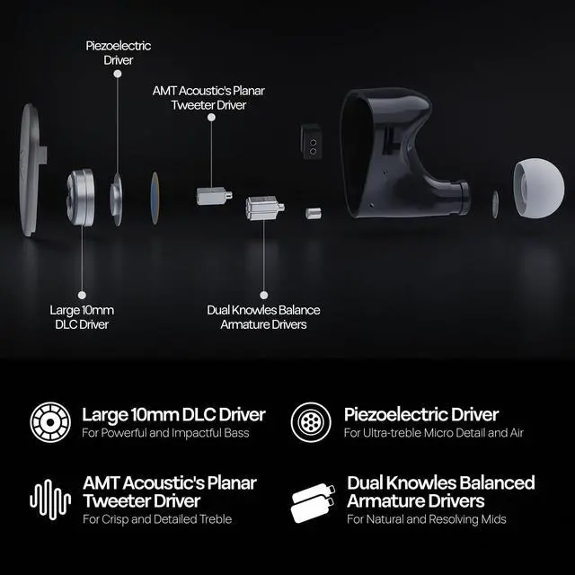 , The Kiwi Ears Quintet utilizes 4 different types of drivers, consisting of 1 Diamond-Like Carbon (DLC) dynamic driver, 2 balanced armature (BA) drivers, 1 planar magnetic driver, and 1 piezoelectric (PZT) bone conductor. With a total of 5 drivers per ear, the Quintet delivers extremely high-resolution audio comparable to professional studio monitors. With this advanced driver configuration, the Kiwi Ears Quintet delivers not only exceptional clarity and precision across the entire frequency range but also a truly immersive soundstage that brings your music to life. ^^ - A large 10mm DLC driver was selected as the sub-woofer due to DLCs high responsiveness and tensile strength, which pumps out impactful bass slams, but with fast decay speeds.