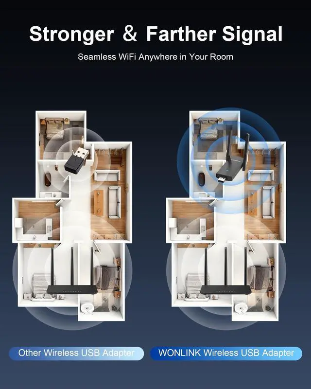 AC1300 High-Speed USB Adapter - Dual band Speeds Up to 1300Mbps, upgrade your network experience or extend your devices lifespan with this wireless adapter. Delivers not only blazing-fast speeds but also rock-solid stability for lag-free gaming and smooth 4K streaming ^^ Dual-Band 5GHz & 2.4GH z Flexibility - Enjoy ultra-smooth 867Mbps (5GHz) speeds for lag-free gaming and high-definition streaming, while delivers reliable 400Mbps ( 2.4G hz) connectivity for stable everyday browsing. Offering the perfect balance between speed and coverage for all your devices ^^ Dual High-Gain Antennas - Two powerful external antennas significantly enhance signal reception and transmission, eliminating dead zones without needing to reposition your router or devices.