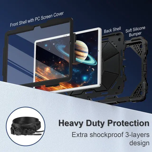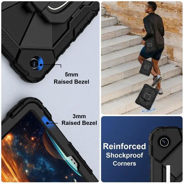 Moreover, the ring stand can be used as a hook to hang on a kitchen cabinet or wherever you need ^^ Mil-Grade Drop ProtectionThis A11+ plus case uses a hard inner shell to maintain structural integrity and a soft outer silicone bumper to absorb vibrations. A 3-layer construction effectively protects your Galaxy A9 Plus tablet from accidental drops or slips. with blue protective film on the built-in screen protector, please PEEL it OFF before use ^^ Hands-Free Shoulder Strap Samsung tab A9+ case comes with a detachable, adjustable shoulder strapessential for technicians, teachers, construction workers, or hikers who need to carry the tablet and keep both hands free for work, holding tools, or climbing.