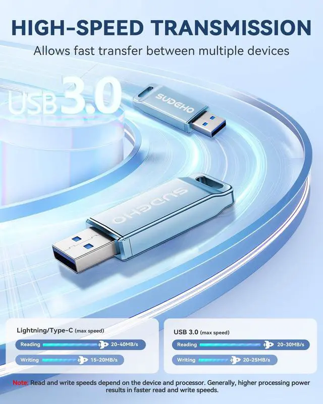 Note: The displayed capacity may differ from 128GB/256GB/512GB due to different calculation methods between storage manufacturers (1GB=1000MB) and computers (1GB=1024MB). ^^ Unique USB with 3-in-1 Adapter Plug and PlayThe thumb drive itself features a standard USB port, and comes with a triangular 3-in-1 adapter (Lightning, USB-C, Micro USB). This design makes it a versatile USB flash drive for iPhone, iPad, Android, Mac and computer. No app required for Android or PCjust plug and transfer. ^^ Fast Transfer Speeds Efficient File BackupWith read speeds up to 40MB/s and write speeds up to 25MB/s, this high-speed photo stick for iPhone allows you to move large videos, photos, or music files in seconds. Save valuable time when transferring or backing up data to your USB flash drive. ^^ Stylish, Portable, and Secure Data StorageMade with a sleek silver and gun black metal casing, this compact iPhone USB flash drive is durable, portable, and stylish. The ROSPE app also supports password protection and encryption, keeping your private files safeideal for travel, business, or everyday use.