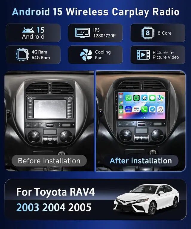 9-Inch with Snapdragon 8-Core 4+64GBFor Toyota RAV4 2003-2005 Car Stereo Experience the pinnacle of in-car entertainment with HD IPS touchscreen car stereo, powered by a robust 8-core processor and featuring 4GB RAM+64GB ROM. Android touch screen car stereo with resolution of 1280*720, while the scratch-resistant, Anki-knock, and high-temperature protection ensure durability. Enjoy a wide color gamut with Display P3/SRGB ^^ Wireless Carplay/Android AutoFor Toyota RAV4 carplay double din dash kit supports wireless Car Play/Android Auto/Mirror link connect, while WIFI and Bluetooth 5.1 ensure swift and stable connections, project the contents of your phone to the large car screen of the Toyota RAV4 car radio, and you can share your favorite videos, pictures, etc.
