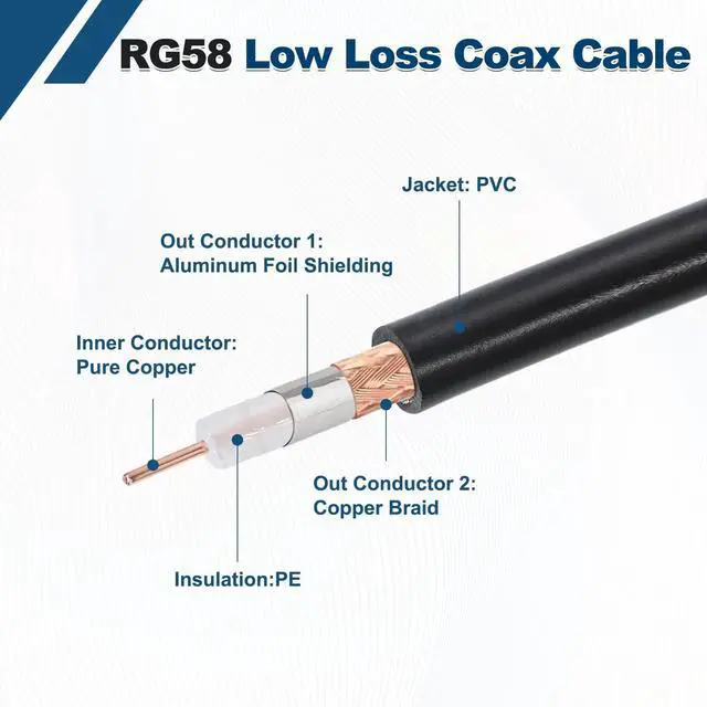Composition: thickened PVC layer, full copper braided shielding layer, solid shielding layer, pure copper wire core; Using RG58 wire 128 high-density pure copper shielding layer, the signal is good and the attenuation is small; Oxygen-free copper core, high conductivity, low resistance, low loss, fast and stable transmission; Long-distance transmission and anti-oxidation. ^^ Align the corresponding connector with the corresponding device end to ensure a secure connection and avoid loosening. ^^ The higher in frequency and the longer of the length, then the greater of the attenuation. Please pick the length according to your usage.