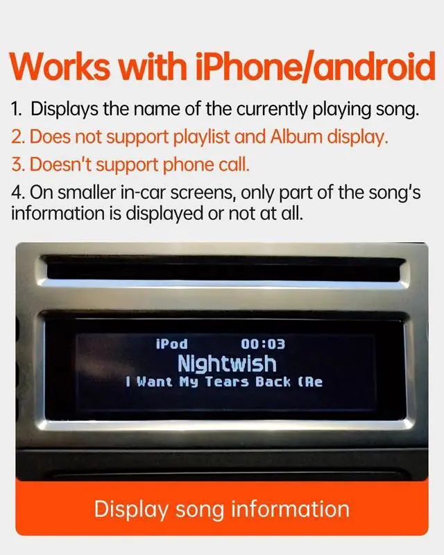 The setup is very simple. Our adapter only has Bluetooth music streaming and does not support phone calls, But you can solve this problem by connecting the adapter's Bluetooth and the car's Bluetooth phone to your mobile phone at the same time. ^^ [STEERING WHEEL AND ORIGINAL CAR MULTIMEDIA BUTTONS TO CONTROL SONGS] Support steering wheel and original car multimedia button control to switch the previous/next song of music. Let you enjoy music conveniently while driving. ^^ [DISPLAY SONG INFORMATION ON IN-VEHICLE SCREEN] All apps do not support displaying song playlists. Spotify/Pandora/Apple Music etc.