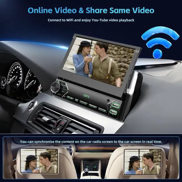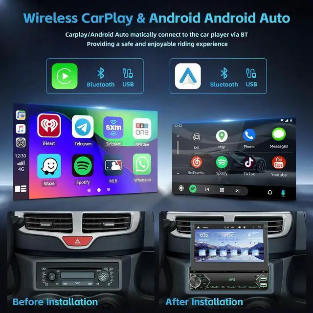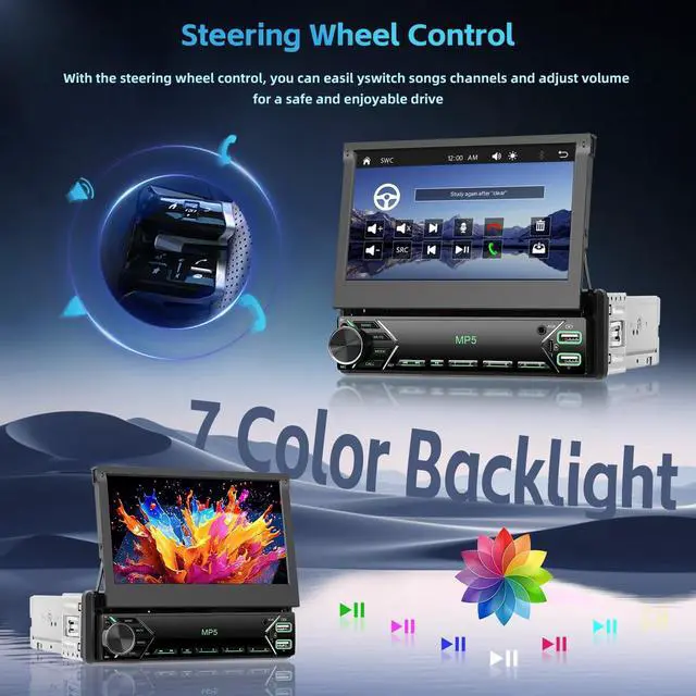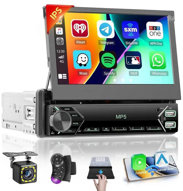 7'' Manual Flip Out Screen Single Din RadioHikity single din touch screen radio adjusts for optimal view and protects when not in use, enhancing dashboard's function & aesthetics ^^ Wireless/Wired Carplay, Android AutoPair your smartphone with 1 din touch screen radio via Bluetooth or USB cable for seamless connectivity, accessing apps and features effortlessly. Voice control lets you stay hands-free on the road; just say 'Hey Siri' or 'OK Google' to activate desired functions ^^ SWC & AHD Backup Camera7 inch flip up screen radio supports steering wheel control for quick function switching. AHD reverse camera with night vision, waterproof, 170 angle auto-switches for safer reversing ^^ Mirror Link for iOS/AndroidThe 1 din car stereo supports Mirror Link.