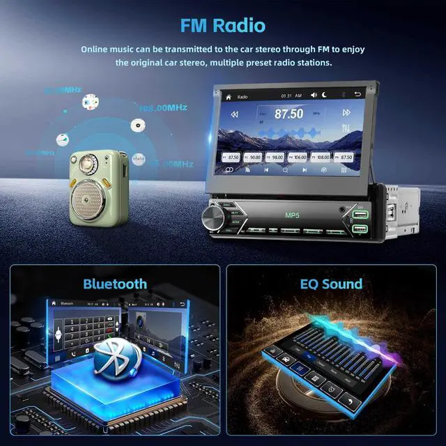 Connect your smartphone via USB, adjust settings, and mirror phone content on the large screen. Access Google Maps, WhatsApp, and BBC Voice easily ^^ Bluetooth & FM/RDS RadioThis single din carplay car stereo supports built-in Bluetooth for hands-free calling/playing music/uploading phonebook. FM/EQ high-quality stereo radio can be preset supports you to listen to music, newsletters, and traffic information anytime and anywhere