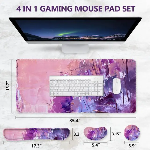 Bottom rubberSize: Large Gaming Mouse Pad - 35.4" x 15.75" x 0.1"K eyboard Wrist Rest Pad- 17.32" x 3.35" x 0.98"W rist Rest Support Pad- 6.8" x 3.7"C up Coaster- 3.93" x 3.93"P ackage Included1 Extended Gaming Mouse Pad1 Keyboard Wrist Support1 Wrist mouse pad1 Cup coaster