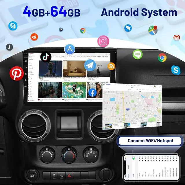 & Fresh Upgrade Android System]: This radio for Jeep Wrangler 2011 2012 2013 2014 is designed fit perfectly with the vehicles original console, offering a high-tech upgrade. It runs on Android system with a 4-core processor, 4G RAM and 64G ROM storage, ensures responsive performance and smoother multitasking ^^ [Wireless
