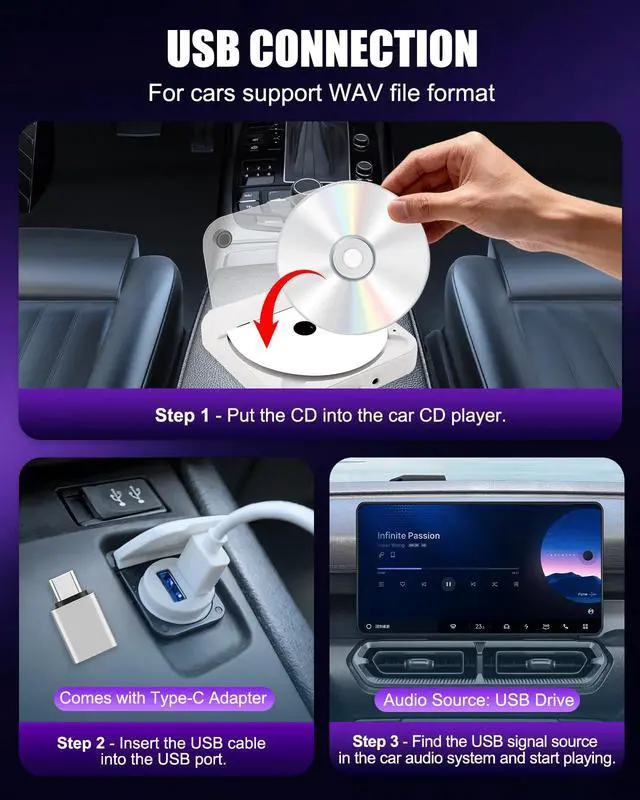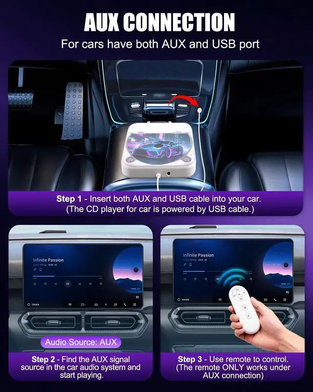 (NOTE: The remote ONLY works under AUX connection) Unsure if its right for your vehicle? Just send us a message on were happy to help! ^^ This external CD player for car works in both horizontal and vertical positions, allowing it to fit perfectly in any spotwhether it's the center console, dashboard, glove box, or other tight spaces. Designed for efficiency, it draws minimal power via USB cable. Unplug the USB cable or take out the CD, it will turn off automatically. ^^ Looking for a thoughtful gift that music lovers will adore? This portable car CD player is a perfect choice! Its sleek, space-saving design fits effortlessly in your car, making it ideal for road trips, daily commutes, or nostalgic music moments. Whether for a music-loving friend, a family member who misses physical CDs, or yourself as a treat, its a practical yet heartfelt present.