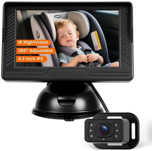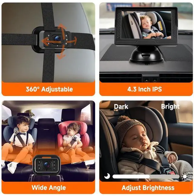 IPS Display: The rear-facing car baby monitor uses a 4.3 -inch HD IPS screen, which is clear and unobstructed. The suction cup bracket is firmly fixed and can be flexibly placed in any position ^^