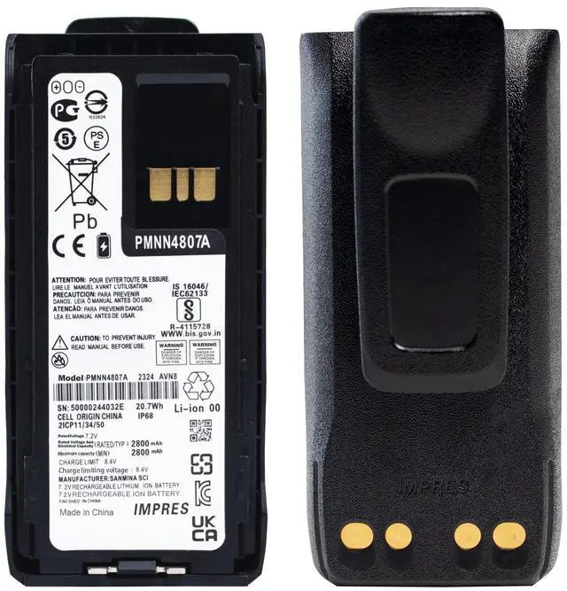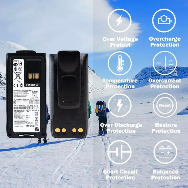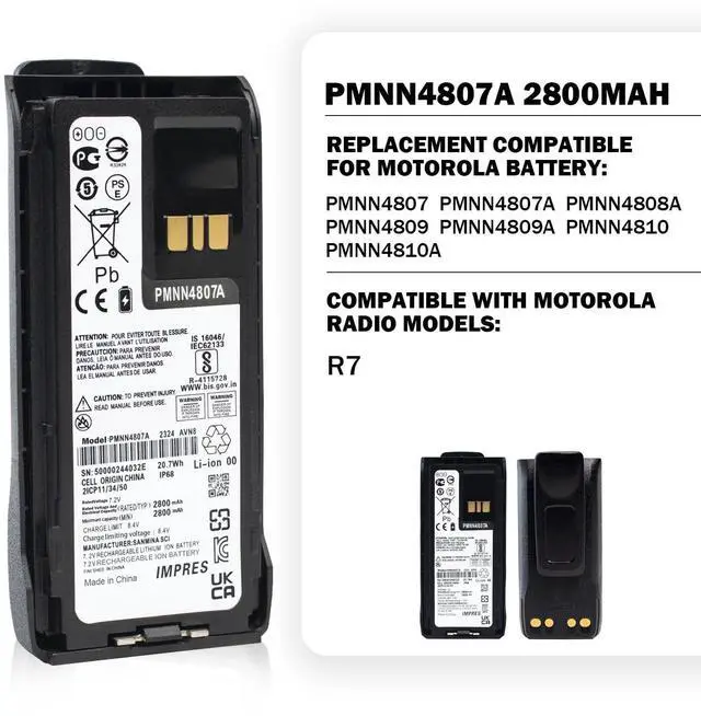 Compatible with Motorola: R7 Walkie Talkie replacement original batteries ^^ Replacement Battery Capacity 2800mAh, Voltage: 7.2 V, Type: Li-ion batteries ^^ Replacement Batteries No Memory effect, you can use it any time and any where. We guarantee you will receive a brand new, high quality battery ^^ Replacement Batteries Safety protection-Safety Ensured, effectively protection Over-charge, over-discharge, over-heat, over-current & short-circuit protection. No Memory effect, you can use it any time and any where