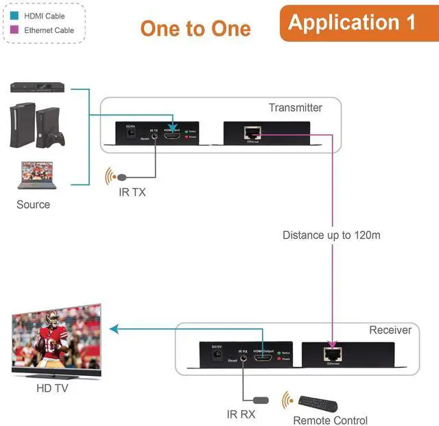 Extends up to 120m (394ft), Uses a Cat5E/6 cable for data transfer ^^ Designed to convert HDMI signal to standard TCP/IP and transmit by internet cable ^^ 1080p, 3D, HDCP, Dolby Trued, DTS Master Audio supported ^^ Supported