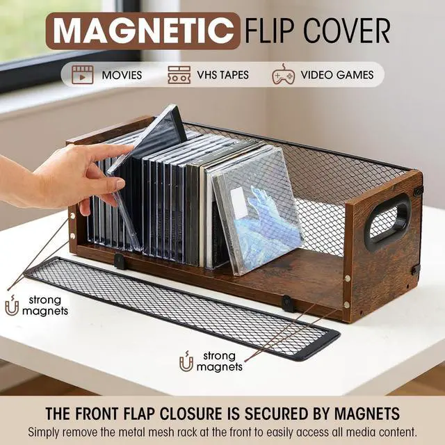 Magnetic Flap: the iron frame closure of the front flap is fixed with magnets, you can easily take it off when in use, which can help you easily access all your music CDs, movie discs, cassettes and VHS tapes; The magnetic fixing device ensures safety and protects your valuable CD collection from falling or misplacing ^^