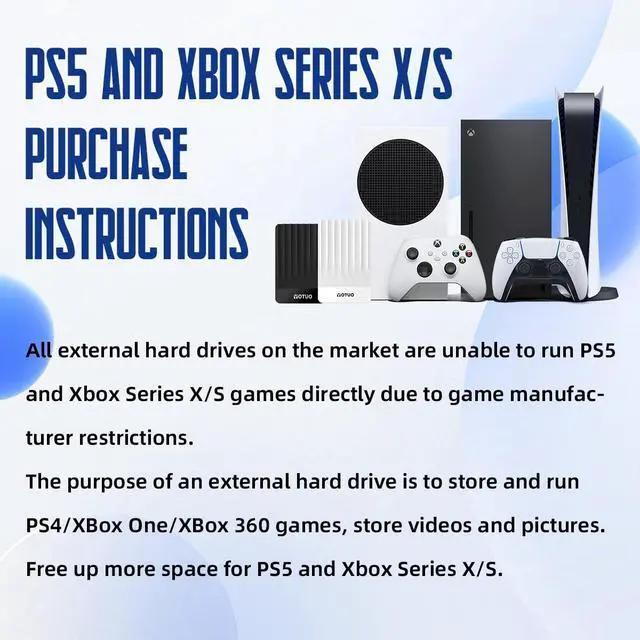 Versatile Storage Expansion For Gaming, Work & Everyday Use Running out of space on your PS5 or Xbox Series X/S? This external hard drive lets you store and play PS4 / Xbox One games directly, instantly freeing up your consoles internal storage for nextgen titles. At the same time, it handles work file backups, media libraries, and crossdevice data transfers with ease. One drive, all your needs.