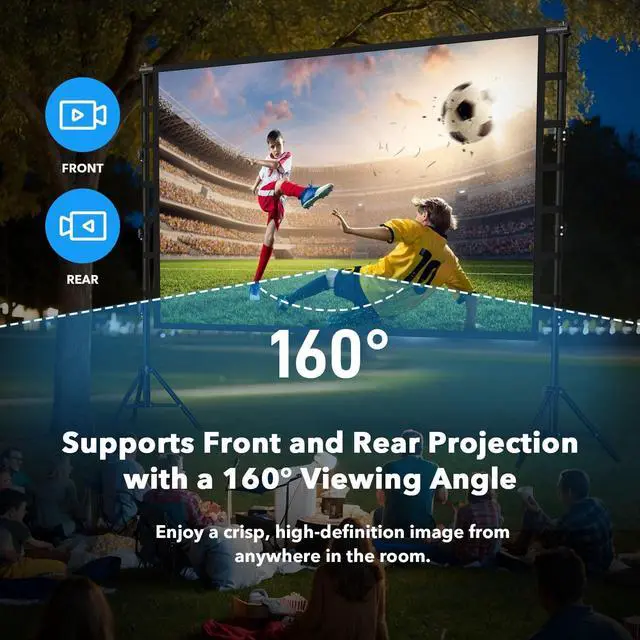 Wrinkle-Free Projection Screen: VOOPVOR 150-inch projector screen, 16:9 format, 160 wide viewing angle, excellent projection, provides high-resolution images and even supports front and rear projection. The projector screen is made of 200g polyester milk silk, which is thicker than other ordinary screens for better visual effect. The movie projector screen is washable, so it's easy to remove stains. Folded and wrinkle-free design brings you more fun and experience a wonderful movie night! ^^