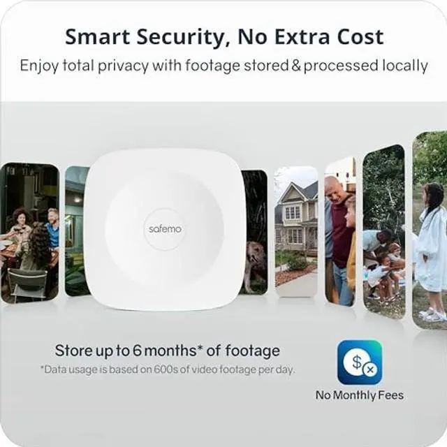 The smart hub is only compatible with Safemo wireless outdoor security camera. ^^ Enhance privacy with our hub-focused AI, safely storing data and footage for up to 6 months* directly on the device. Eliminate cloud reliance and external services, ensuring immediate access without subscriptions or extra costs. A smart, secure solution for peace of mind. ^^ Add up to 4TB of footage via SSD* hard drive or upload videos to the cloud if needed.