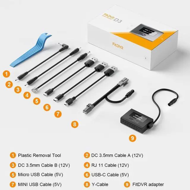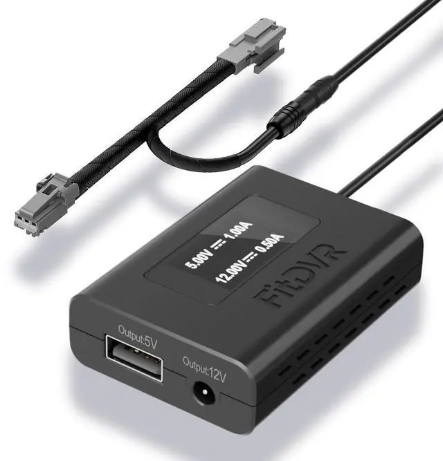 Vehicle CompatibilitySuitable for Ford Ranger 2019-2023 and Escape 2013-2020 with Auto-dimming rear view mirror. Please confirm your vehicle has a 3-pin connector before purchasing. ^^ Dual Voltage OutputInput voltage is 12V, with output options of 5V (USB cable) and 12V (DC 3.5 mm cable). ^^ 6 Output Cables IncludedIncludes Mini USB (5V), Micro USB (5V), USB-C (5V), RJ11 (12V) and DC 3.5 mm (12V) cables. ^^ LED DisplayThe FitDVR adapter features an LED screen that displays current and voltage, a unique feature compared to other brands. ^^ Easy InstallationSpecial wiring harness connection for plug-and-play installation.
