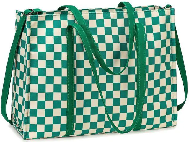 Laptop Tote Bag for Women Work 15.6 inch Canvas Shoulder Bags Computer Messenger Purse Teacher Handbag Office Briefcase (Green-White Checkered)