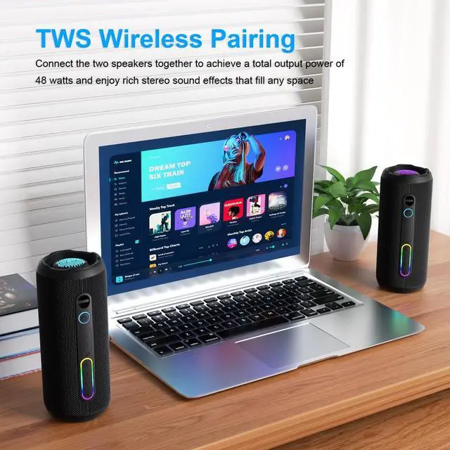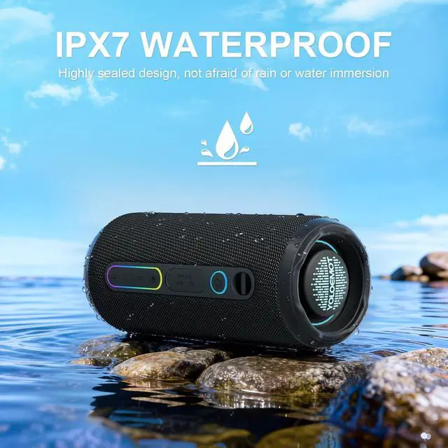 IMMERSIVE SOUND EXPERIENCEThe YOLOEMOT Small Bluetooth speaker is built with 24W dual-channel stereo drivers, delivering crisp treble, rich midrange, and punchy enhanced bass at any volume. Engineered with a high-performance audio system, it produces full, immersive Hi-Fi stereo sound that easily fills any room or outdoor space. Pair two speakers together via TWS function to experience the surround sound of a movie theater, bringing you an auditory experience that's truly unparalleled ^^ WATERPROOF AND DESIGNIt features a robust IPX7-level fully sealed waterproof and dustproof protection, easily coping with splashing water.