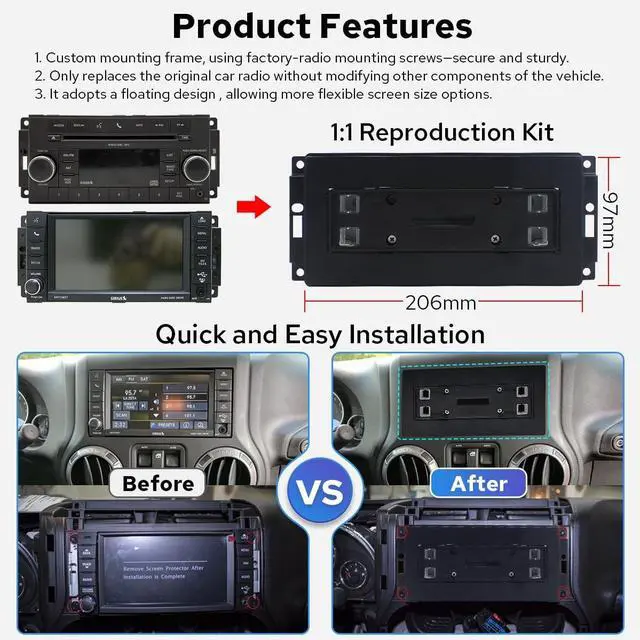 Plug and Play Car StereoNon-destructive installation, can be directly plugged intothe original power cord to use, no need to cut the cable. ^^ Specialized Mounting Surface FramesUse the original car fixed position and screws, safe and secure. Only replace the original car stereo, do not change other parts of the original car. ^^ Floating TouchscreenThe screen is mounted in a floating design, with a more flexible choice of screen sizes. ^^ GPS NavigationPrecise GPS engines, more accurate positioning, including GPS antennas, can better receive satellite signals, thus ensuring faster real-time navigation.