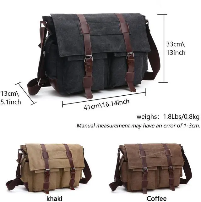 Large Laptop Storage - Fits laptops up to 15.6 inches, documents, and accessories inside a secure main compartment with vintage appeal. ^^ Well-Organized Interior - Features a spacious main zip pocket, two inner slip pockets for phones or chargers, and a zip pocket for valuables. ^^ Multiple External Pockets - Includes a rear zip pocket, two front slip pockets under the flap, and two side pockets for water bottles or accessories. ^^ vintage Canvas - Built from heavy-duty canvas with leather details, offering a classic, timeless, and durable design.