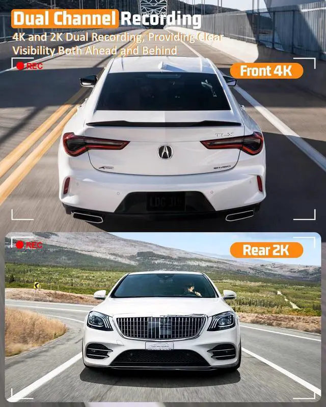 4K+2K dash cam front and rear This dash cam 4k features a front camera that supports 4K ultra-high-definition recording and a rear camera with 2K high-definition quality. The dual lenses work together to fully record the dynamics in front of and behind the vehicle. A 170 wide-angle front view and a 150 rear view provide seamless coverage, effectively reducing blind spots. Whether for daily driving or long-distance trips, it captures every important moment with stunning image quality. ^^ Built-in WiFi & App-ControlledThis dashcam features a built-in Wi-Fi module for easy connection to your smartphone.