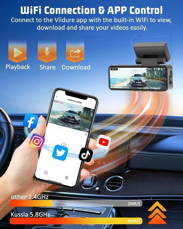 Through the official Viidure app, you can view real-time front and rear road conditions on your phone, playback historical recordings, quickly download video files, and share exciting moments with a single tap. This dash cam is equipped with a 3.2 '' high-definition display, supporting simultaneous recording and display of both front and rear views for more intuitive monitoring. ^^ Superior Night VisionThis dash camera features an F 1.5 ultra-large aperture and a 6-layer high-transmittance lens, combined with WDR technology, significantly improving image performance in nighttime and low-light conditions. Even in complex scenarios such as headlight glare, alternating bright and dark areas in tunnels, or insufficient lighting on nighttime roads, car dash cam can record images with true colors and clear details, providing reliable safety protection for nighttime driving.