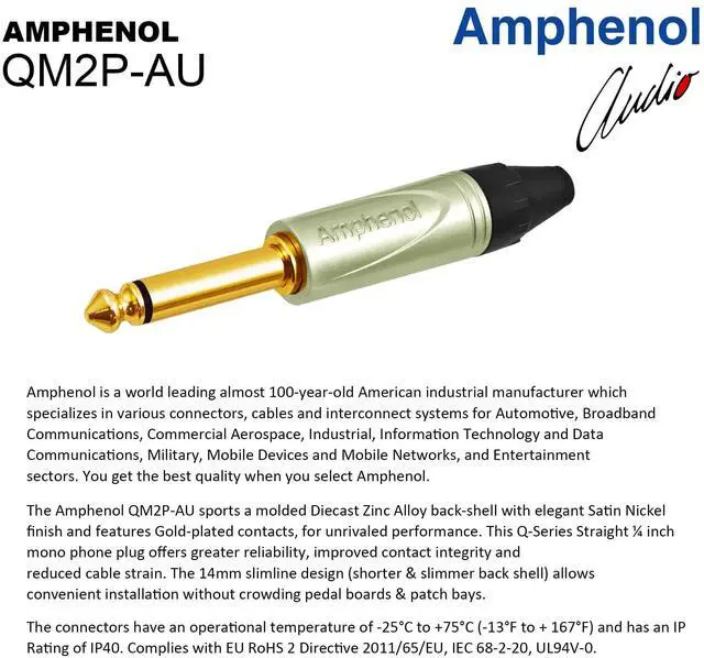 These high-value, high-quality cables will not break your bank and the integrity of your creative process. With WBC-PRO you are buying a product made with love and the utmost care for quality. WBC-PRO, the only cable you will ever need! ^^ The brand of connector used for this cable assembly: Amphenol is an almost 100-year-old US company. Their QM2R-AU & QM2P-AU plugs sport molded metal back-shells with elegant Satin finish and feature Gold-plated contacts, for unrivalled performance. This Q-Series Angled & Straight inch mono phone plugs offer greater reliability, improved contact integrity and reduced cable strain. The slimline design (shorter & slimmer back shell) allows convenient installation without crowding audio equipment. ^^ All our cables are professionally soldered using WORLDS BEST CABLES proprietary 4% silver solder blend & a nitrogen-assisted soldering process unique to us, exceeding industry standards, improves integrity of solder joints over traditional methods. ^^ These cables are lovingly assembled by WORLDS BEST CABLES, we offer the largest array of custom-built cables in the market, we carry all the major cable and connector brands. We have served millions of customers with quality assemblies for many years - this sale is for a single 50 Foot long cable. Cable length is measured from TIP to TIP of each connector (please refer to the image gallery).