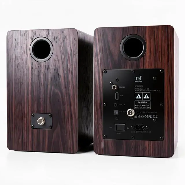The stereo pair creates wider imaging and better left-right separation than single-box speakers. ^^ Modern Bookshelf Speaker Styling with Versatile Home Audio Use Finished in Dark Walnut, H3 brings a cleaner, more refined bookshelf-speaker look to desks, media consoles, and shelves. It fits naturally into music, movie, and desktop setups while offering the connection flexibility and stronger output many basic computer speakers do not provide.