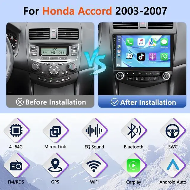 The large memory capacity ensures smooth multitasking and efficient performance. Equipped with a 4-core processor, the car stereo delivers high-definition performance for a seamless user experience. Enjoy the stunning visuals on the 10-inch HD touch screen with a resolution of 1280*720, providing ultra-high definition clarity! ^^ Wireless CarPlay and Android AutoCompatible with Honda Accord 2003-2007, this car stereo radio supports wireless CarPlay and Android Auto. Connect your iPhone or Android phone wirelessly to control apps and access your phone's features. Simply use voice commands or touch controls to make calls, send messages, play music, and so on.