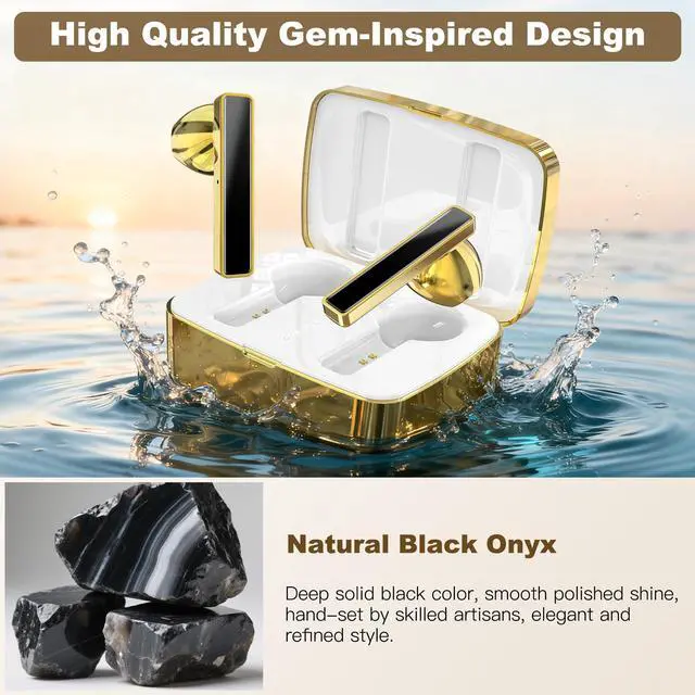 First-Time Setup Please charge both earbuds fully in the charging case before first use to ensure proper connection and optimal performance. ^^ [One of a Kind - Black Agate Inlay] Sourced from Brazil, this natural black agate has long been admired for its radiant beauty and enduring strength. Revered since ancient times as a symbol of harmony, happiness, and prosperity, agate was believed to bring balance to the mind and protection to the spirit. Its deep ebony tones reflect natures quiet strength. Every agates unique color and pattern make each pair of earbuds a one-of-a-kind work of art.