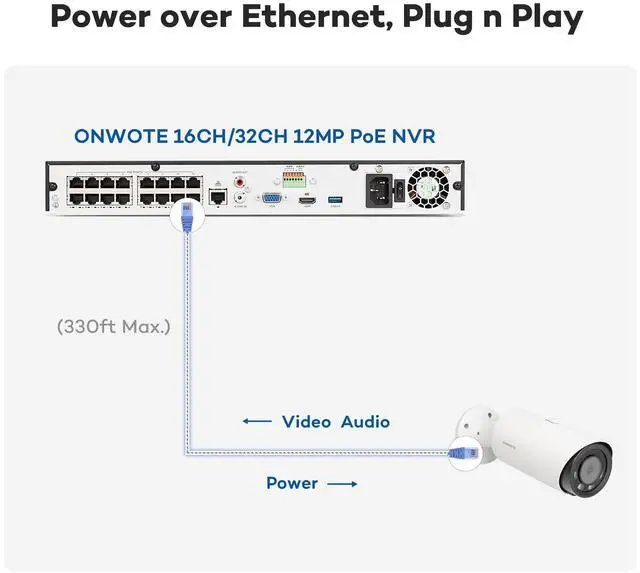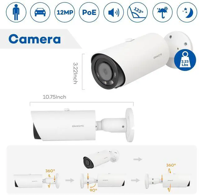 6K Superior Definition-- 12 million pixels, 123 diagonal field of view. ^^ Capture and Record Audio-- Cameras capture sound and NVR record it. Output audio to a HD TV or mobile APP. ^^ Smart AI Human Vehicle Detection-- Reduce false alarms and save storage space. ^^ Smart Color Night Vision-- AI human vehicle detection activate bright spotlights, deliver color night vision. ^^ IP66 Durable Housing-- Metal housing, indoors or outdoors, fully weatherproof. ^^ Infrared Lights-- Enable infrared lights automatically at night, IR night vision up to 100ft. ^^ Add-on to ONWOTE System-- Work with ONWOTE 12MP/ 8MP PoE NVR or PoE switch with 48V-54V power supply.