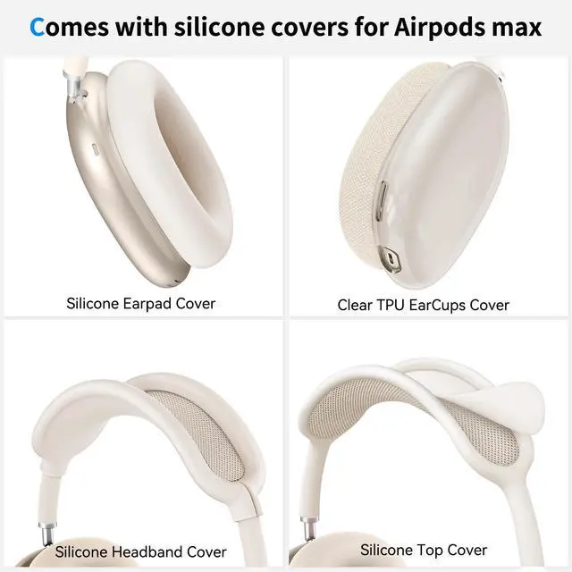 ^^ What You Get: A Hard Carrying Case for AirPods Max, A pair of clear TPU AirPods Max Ear Cups Covers, A pair of Silicone AirPods Max Earpad Covers, A Silicone AirPods Max Headband Cover, A Silicone AirPods Max Top Cover.