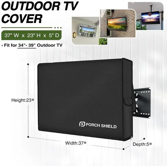 Dimension - 37L x 23H x 5D inch. Suitable for 34-39 inches LCD, LED and Plasma Flat TV Screen with cables. ^^ Upgrade Function - Zipper on the bottom delivers 360 full protection and rear cover shield expanded provides more protection for TV back, Especially on rainy day. ^^ Material - Made of 600D oxford with waterproof coating and seam sealing taped. Heavy duty fabric make outside TV cover good performance of dustproof, waterproof and weatherproof to against severe weather and soft inside fabric can't scratch your TV. ^^ Mount Compatibility - Back Velcro strip instead of back zipper.