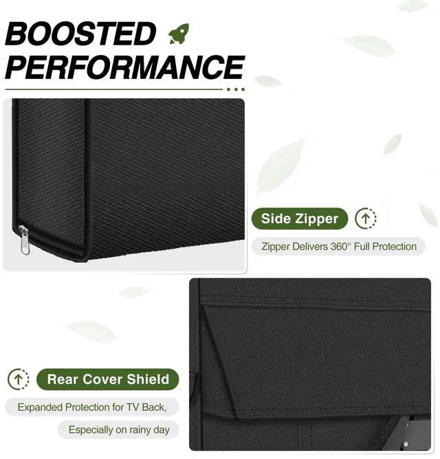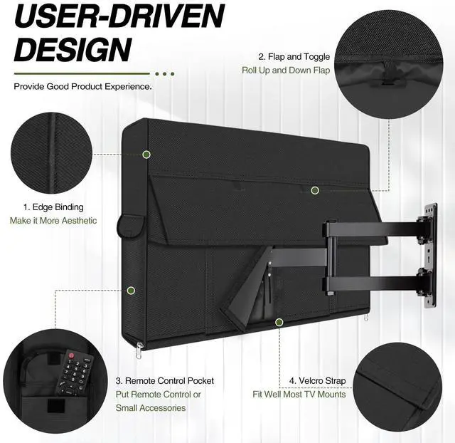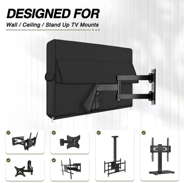 Compatilbe better with sorts of wall/ceiling mounts and stands. Back space enough also makes it easier for you to hide TV cables, wire etc. ^^ Installation - Velcro at the bottom for easily installing and removing. With the velcro firmly fastened, Outdoor TV cover will provide your patio TV with full protection and let outside television looks alomost like new.