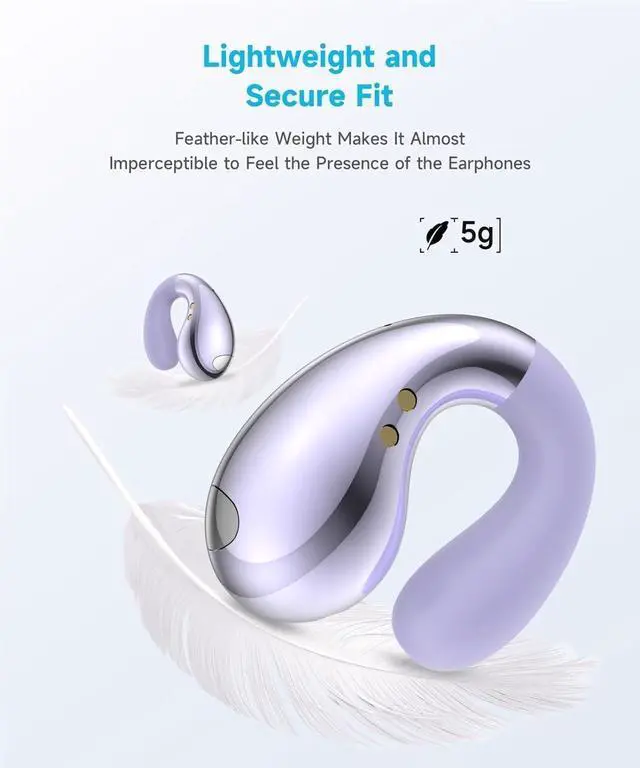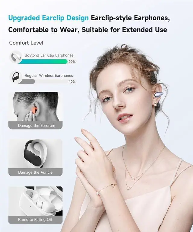 Stay connected to your surroundings while enjoying clear, rich sound with these open ear headphones. The open ear earbuds design promotes ventilation and reduces discomfort during extended use, making them perfect for activities like hiking, traveling, or exercising. These clip on earbuds offer unparalleled comfort and performance for any occasion. ^^ Designed for all-day use, these ultra open earbuds are lightweight and secure, with flexible clips that keep them comfortably in place. These ear clip earbuds let you stay aware of your environment without sacrificing sound quality, making them ideal for work, social gatherings, or on-the-go activities.