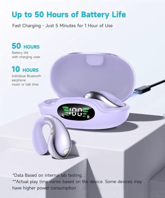 With a design that feels natural, these clip earbuds ensure maximum convenience. ^^ & - Powered by 16.3 mm drivers, these bone conduction earbuds deliver vibrant, high-fidelity stereo sound and enhanced call quality. Whether enjoying your favorite playlist or handling important calls, these open ear clip earbuds ensure every detail comes through with stunning clarity. ^^ Enjoy up to 10 hours of continuous playtime on a single charge and an additional 40 hours with the charging case. These clip on ear buds also feature fast chargingjust 5 minutes of charge provides 1 hour of playback.