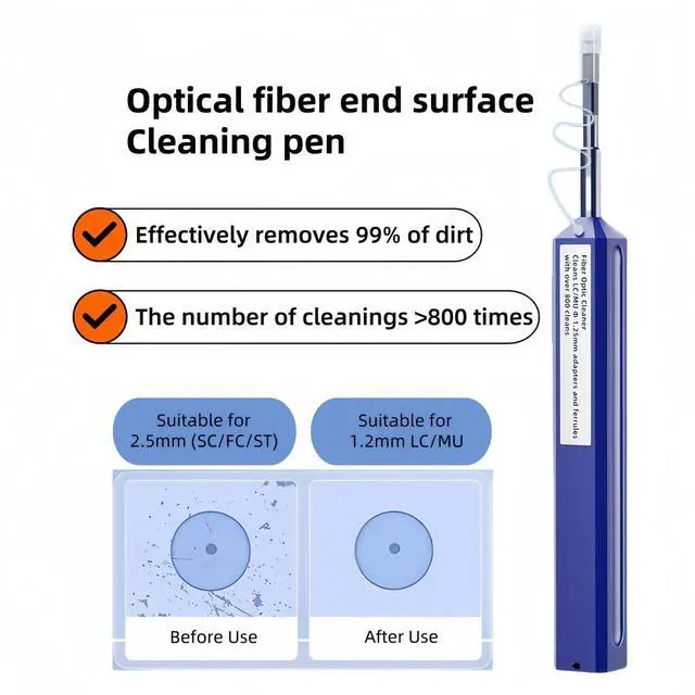 More than 800 cleaning timesThe optical fiber cleaning pen is easy to operate and has outstanding cost performance. More than 800 cleanings, lowering your cost per clean while maintaining results. ^^ Highly efficient removal of stainsNo need to wipe with alcohol, just 1 touch can remove dust, oil, etc. from the fiber end face, rotateing 180for a full sweep, can effectively remove dust and oil. ^^ Easy to operateOne touch design, One press can complete the cleaning and automatically replace the cleaning filament, can effectively ensure that the cleaned end surface is free from secondary pollution.