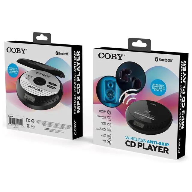 RETRO CD PLAYER WITH BLUETOOTH FUNCTIONALITY The Coby Portable Bluetooth CD Player brings back the joy of classic music with a modern wireless twist. Connect to Bluetooth speakers, earbuds, or car audio systems, or use the included wired headphones for clear, distortion-free sound anywhere. Ideal for travel, home, or office use. ^^ PORTABLE MUSIC PLAYER WITH FM RADIO & AUX INPUT Enjoy your favorite CDs, MP3 discs, or FM stations all in one lightweight, compact device. Perfect as a retro boombox alternative or portable radio for home, dorms, or travel.