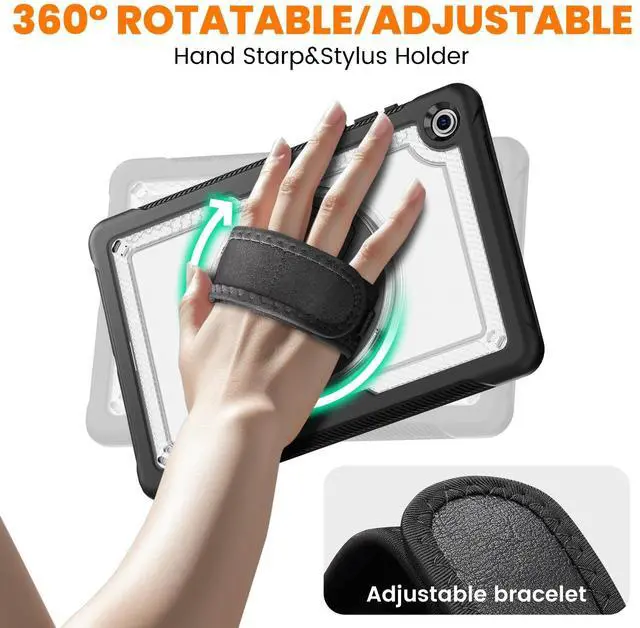 Adjustable Shoulder Strap: Equipped with an adjustable strap (60-150cm) supports both single-shoulder and cross-body carrying styles, and can be quickly detached without any tools when not needed. Perfect for outdoor activities, fieldwork, or keeping your tablet secure while on the move ^^ Rotating Stand & Adjustable Hand Strap for Productivity & Entertainment, Built-in