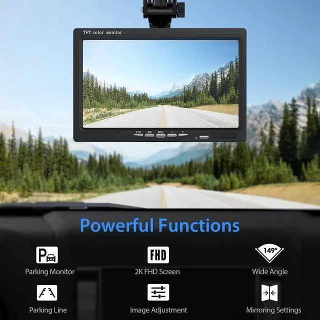 2K Clear Iamge 7'' High Resolution monitor with built-in CMOS upgrade chip provides vivid images. Designed for Car, Pickup Truck, SUV, RVs, Minivan, Sedans etc.