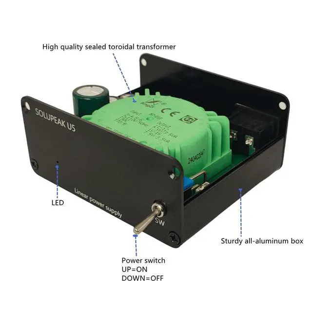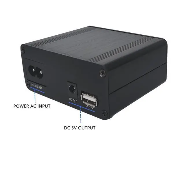 This is a DC linear PSU/power converter box. Specialized for set-top box or player or other audio devices. It uses stable LM317 regulator chip, and 7VA Bingzi sealed transformer. With low noise DC 5V output voltage, for a better or purer power supply environment. It is a mini size adapter that suitable to use on desktop.