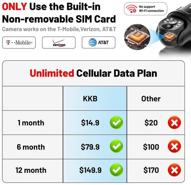 • Unlimited Data & Live ViewingKKB 4G LTE Security Camera only supports the built-in SIM card (non-replaceable) to connect to Verizon, T-Mobile, and AT&T's 4G cellular network to ensure compatibility and stability. 300MB prepaid data is provided for connecting the camera. Data plans are renewable within the app at 14.9 USD/month, 79.9 USD/6 months, 149.9 USD/year. Enjoy unlimited data any time you want to watch