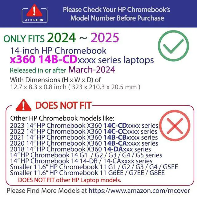 NOTE: Before placing order, PLEASE make sure to verify your laptop model number as this case is MODEL specific and NOT interchangeable. ^^ NOT fitting other HP Chromebook laptops. NOT compatible with ANY other HP laptops as well. ^^ Made of high-quality translucent polycarbonate material which is shatter-proof and will protect your 14" HP Chromebook x360 14B-CD0000 series Notebook Computer all around ^^ Designed to perfectly fit the 14" HP Chromebook x360 14B-CD0000 series Notebook Computer with dimension of 12.7 x 8.3 x 0.8 inch ( 323 x 210.3 x 20.5 mm ) ^^ 2-piece light-weight ( 8.3 oz or 235 g ) shell easily snaps on and off.