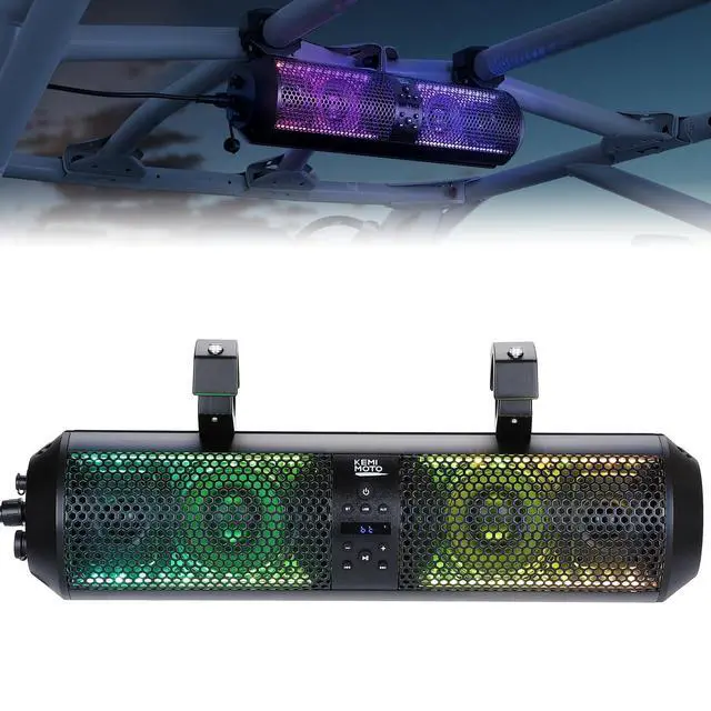 Roll Bar: The Kemimoto 18-inch Waterproof UTV sound bar offers convenient installation options for roll cages measuring 1.56" to 2.25". Kemimoto utv speaker with lights will be compatible with a wide range of vehicles including UTVs, ATVs, Golf Carts, Marine vessels, and other off-road vehicles.