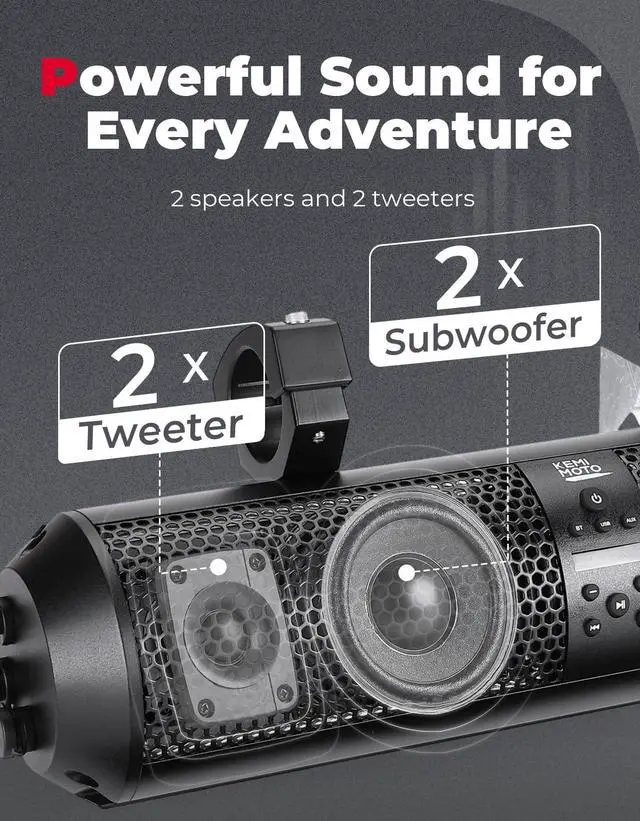Clear Sound: Equipped with two 4'' full-range speakers and two 1'' soft dome tweeters, the KEMIMOTO sound bar is powered by a high-performance 400W to provide you a loud music even during riding.